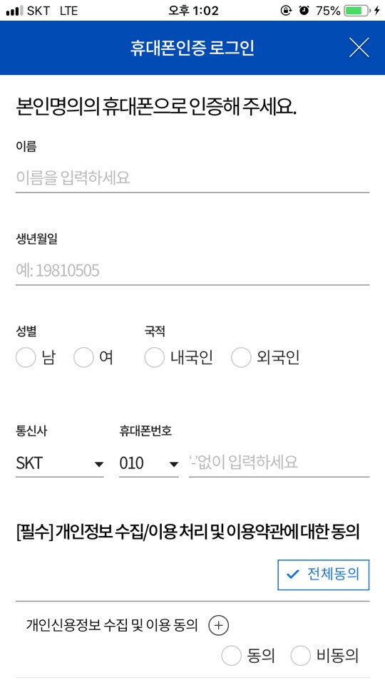이름, 생년월일, 성별 등을 입력하고 휴대폰 인증을 받습니다.