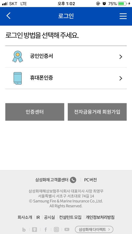 공인인증서 또는 휴대폰으로 로그인이 가능합니다. 휴대폰에 공인인증서가 존재한다면 해당 방법으로 로그인하시면 되지만 저같은 경우, 존재하지 않기 때문에 간단하게 휴대폰 인증으로 진행했습니다.