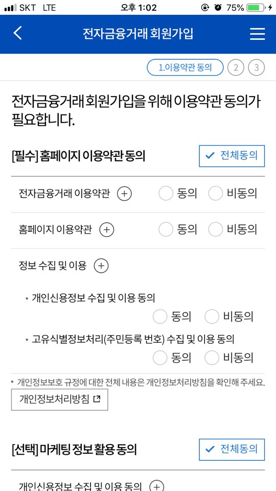 휴대폰 번호로 로그인을 진행하려면 전자금융거래 회원가입도 동시에 진행해야 합니다. 위에서 휴대폰 인증을 마치고 나면 위같은 화면이 나올테니 연속으로 진행하시면 됩니다.