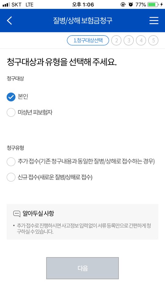 청구대상과 청구 유형을 선택합니다. 저는 신규 접수이기에 신규 접수를 선택했습니다. 그리고 다음 버튼을 누릅니다.