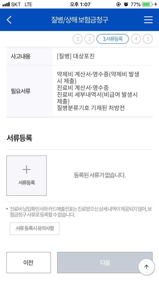 이제 증빙 서류를 등록해야합니다. 저같은 경우 병원 진료비가 링겔을 포함하여 5만원, 약국에서 약 처방비용이 3만원 정도 나왔습니다. 병원 진료비의 경우 병원측에 요청하여 영수증을 떼와서 첨부하면 되고 약국 처방비용의 경우, 약 봉투를 첨부하면 됩니다.