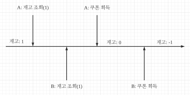 예를 들어 100개의 쿠폰을 발급할 수 있다고 가정해보자. 99개의 쿠폰이 소진되었고 재고가 1개 남은 상태이다. 이때 A라는 유저가 재고를 조회하고 데이터베이스에서는 1개의 재고가 남았다고 알려준다. 그리고 동시에 B유저가 재고 조회를 진행하고 마찬가지로 데이터베이스에서는 1개의 재고가 남았다고 알려준다.