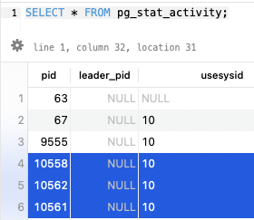 사전 지식 섹션을 통해 알겠지만 현재 구성은 Request per session이다. 하지만 하나의 세션에서 모두 동일한 DB커넥션을 사용하는것이 아니라 각 커넥션이 block될 때 마다 새로운 커넥션을 풀에서 꺼내와서(또는 새로 생성해서) 사용하게 된다. 위 코드를 실행한 이후 데이터베이스에서 커넥션 리스트를 확인해보면,