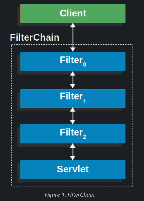 클라이언트가 요청을 보내면 컨테이너는 FilterChain을 생성한다. 해당 클래스는 요청 URI기반으로 HttpServletRequest를 다루는 Filter와 Servlet인스턴스를 포함하고 있다. 스프링 MVC에서 Servlet은 DispatcherServlet의 인스턴스이다. 적어도 한개 이상의 서블릿이 단일 HttpServletRequest 및 HttpServletResponse를 처리할 수 있다. 하지만 하나 이상의 필터를 통해 아래의 작업을 수행할 수 있다.