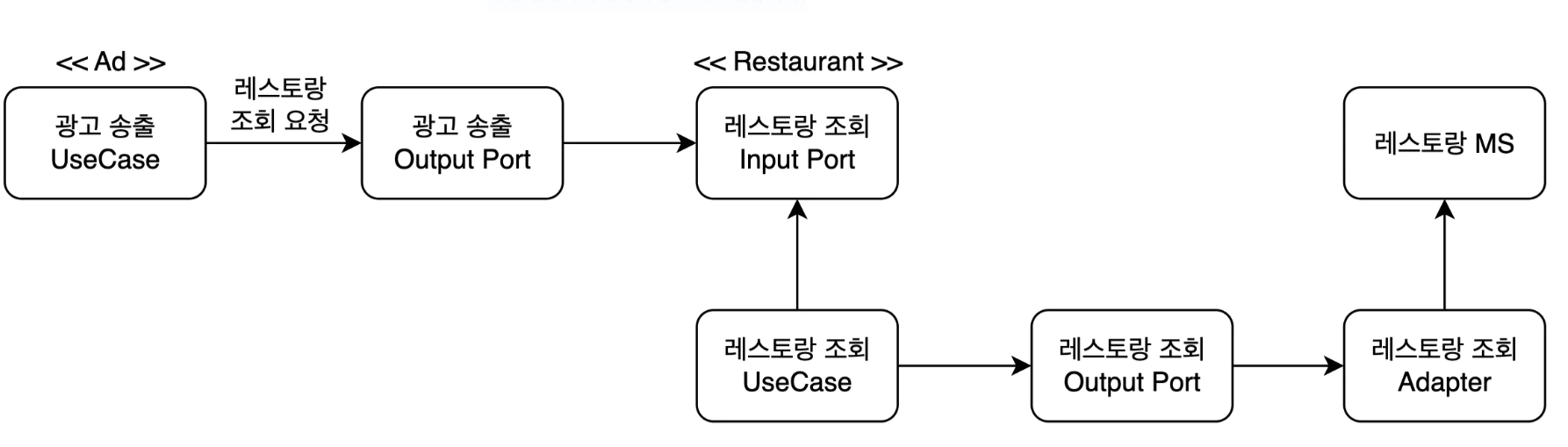 - 광고 송출 유즈케이스는 Output Port를 통해 레스토랑 애그리거트에 레스토랑 조회 요청을 보냅니다.