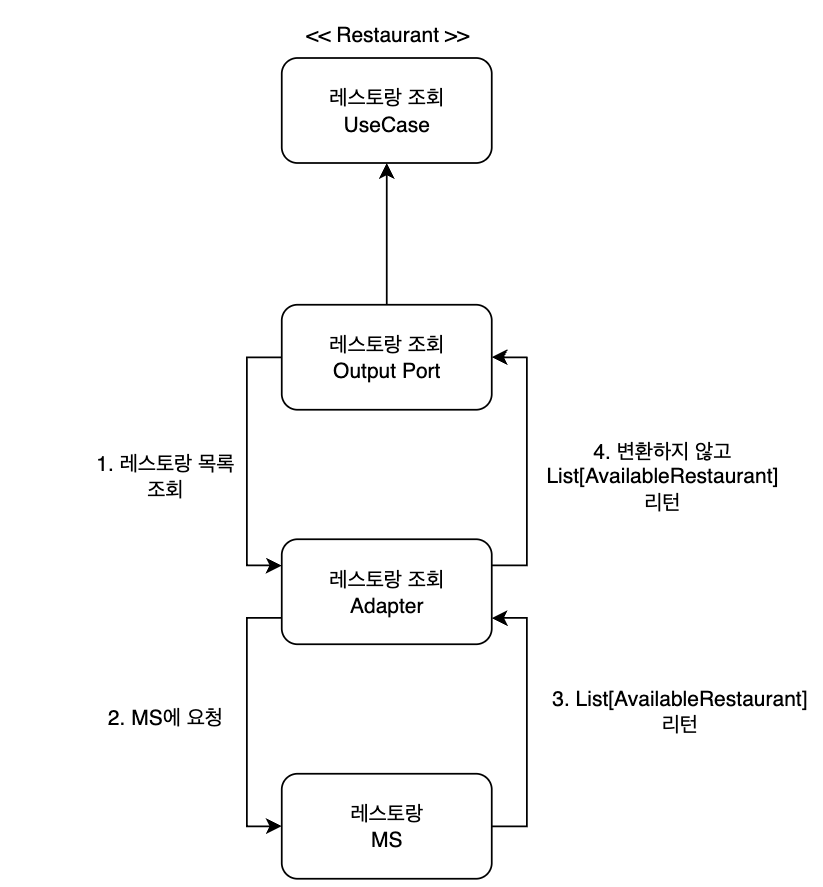 - 어댑터는 실제 레스토랑을 담당하는 MS에 요청을 보내고 받아온 응답을 통해 레스토랑 목록을 반환합니다.
