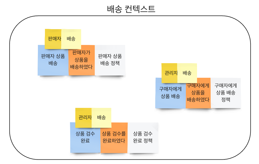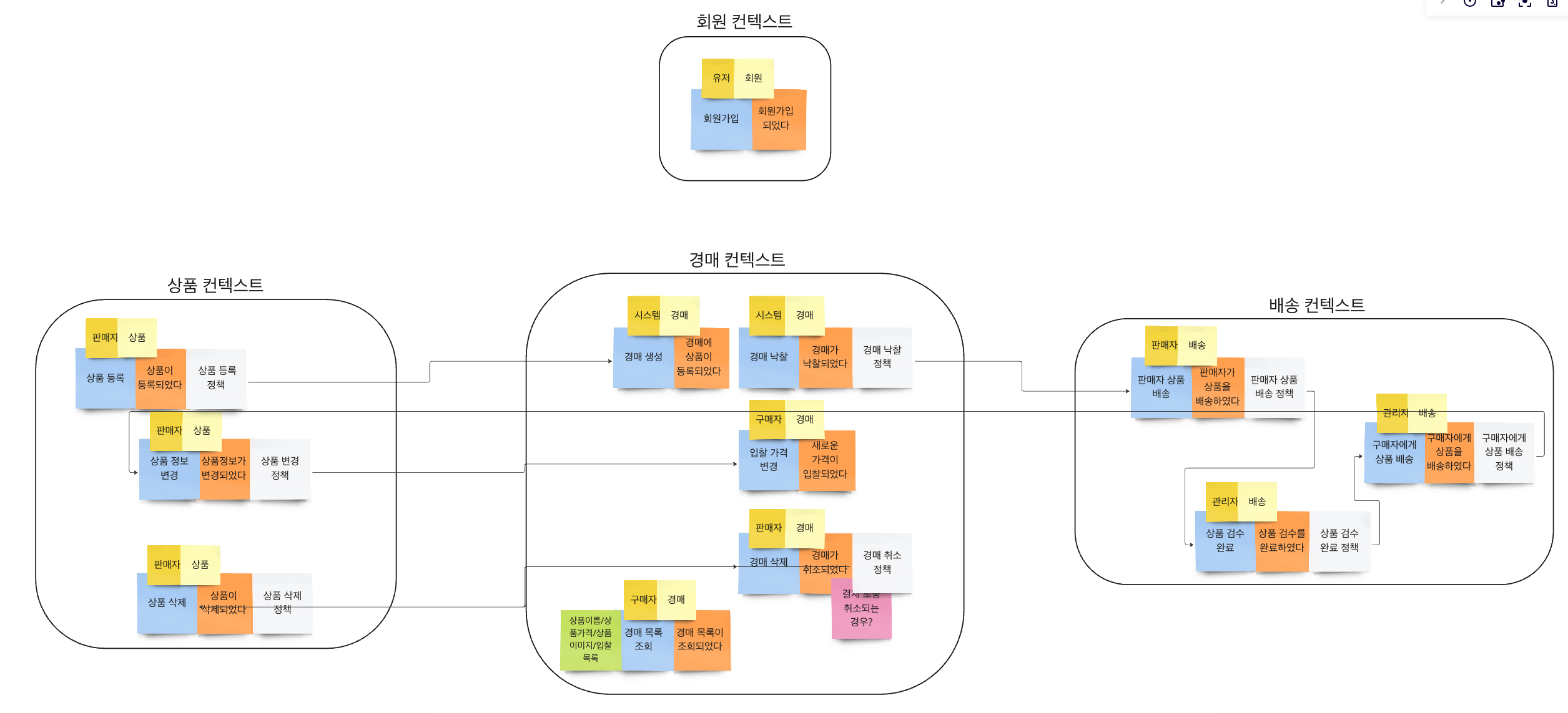 그동안의 단계를 걸쳐서 도출했던 도메인 이벤트, 커맨드, 액터, 애그리거트를 모두 고려하여 경계를 식별한다. 이렇게 도출된 결과물을 연관있는것끼리 그룹핑하여 각 그룹마다 가지는 명확한 경계를 바운디드 컨텍스트라고 한다.