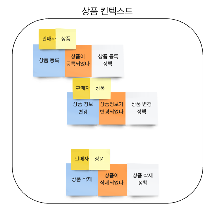 먼저 파란색 포스트잇으로 커맨드를 도출한다. 커맨드는 시스템에서 발생하는 일로써 도메인 이벤트가 발생하는 원인이다. 커맨드는 동사로 작성한다. 본 예제에서는 없는 케이스지만, 하나의 커맨드에 의해 여러개의 이벤트가 동시 또는 연속적으로 발생할 수 있으며 조건에 따라 하나의 커맨드에 여러개의 다른 이벤트가 발생할 수 있음을 유의한다.