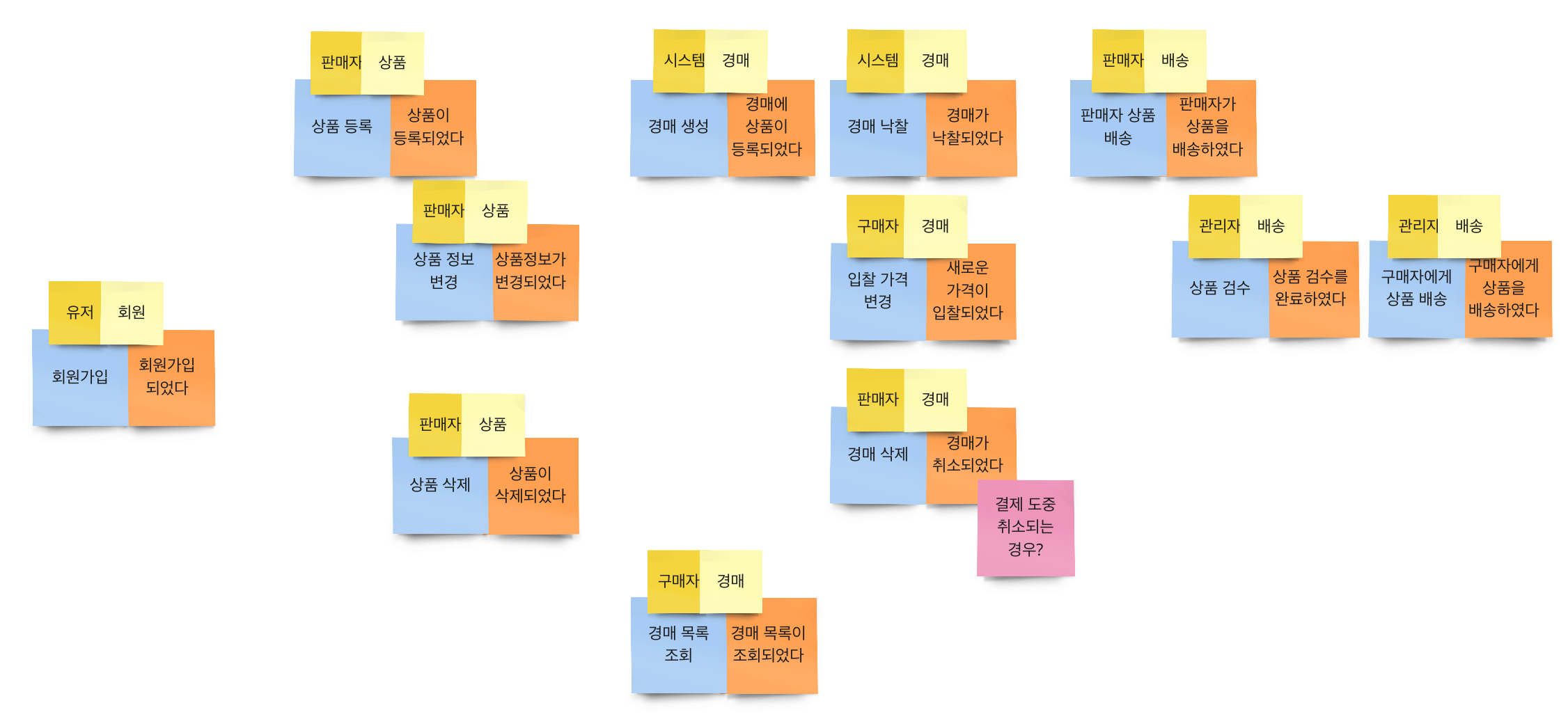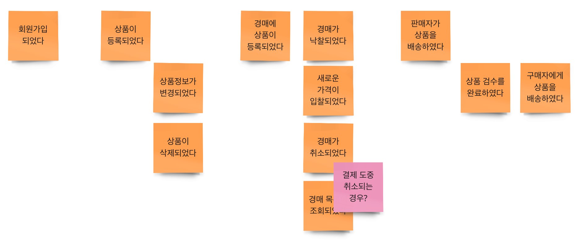 이벤트 스토밍 도중 의문 사항이 생기거나 현재 참여자들끼리 결정하기 힘든 사항이 도출될 수 있다. 이러한 내용을 핫 스팟이라고 하는데, 지금 당장 결정하지는 않더라도 잊지않기 위해 위처럼 해당하는 도메인 이벤트 아래쪽에 포스트잇을 추가해준다. 본 예제에서는 기능 자체가 작기 때문에 결제 도중 취소되는 경우 하나만 핫 스팟을 도출하였다.