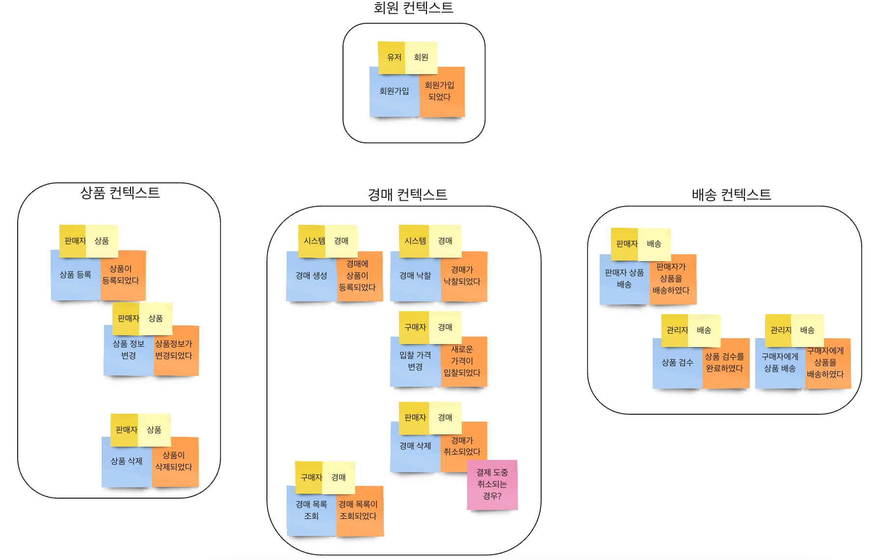 그동안의 단계를 걸쳐서 도출했던 도메인 이벤트, 커맨드, 액터, 애그리거트를 모두 고려하여 경계를 식별한다. 이렇게 도출된 결과물을 연관있는것끼리 그룹핑하여 각 그룹마다 가지는 명확한 경계를 바운디드 컨텍스트라고 한다.