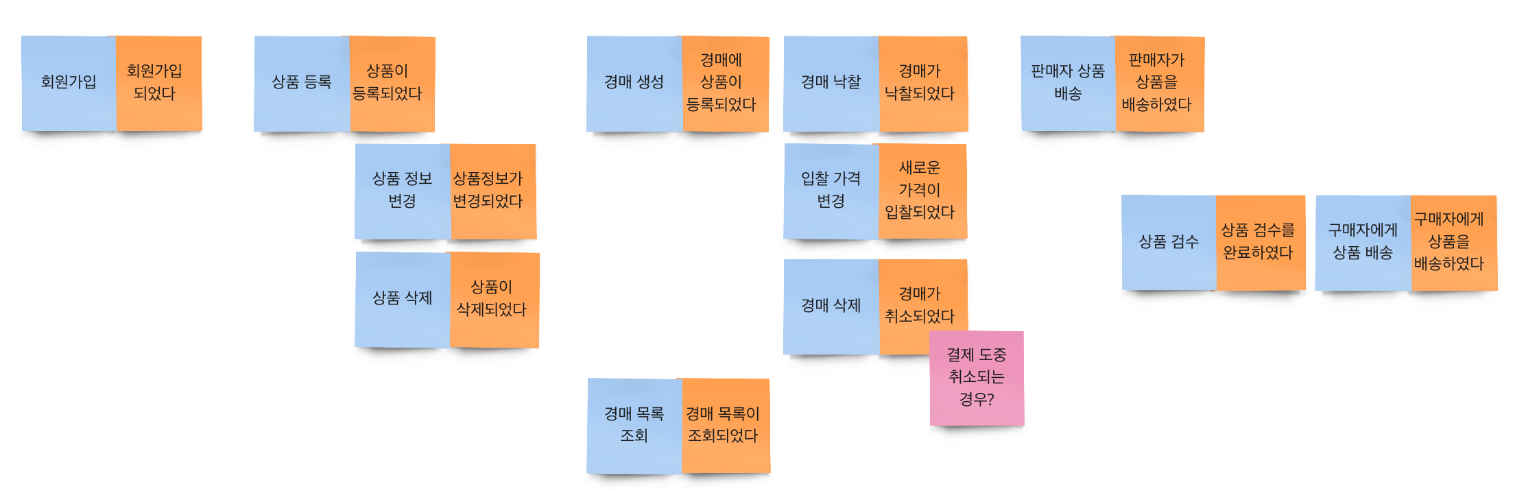 도메인 이벤트는 과거에 일어났던 일을 표현하기 위해 과거 시제를 사용하며 이벤트가 발생한다는 것은 상태가 변경되었음을 의미한다. 본 단계에서 모든 이벤트를 추출하지 않아도 괜찮다. 단계를 진행하며 추가적으로 도출되는 이벤트는 그때마다 추가해도 된다.