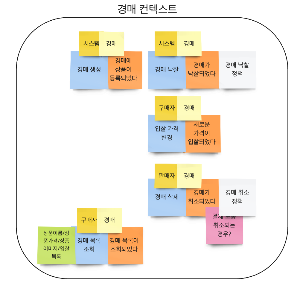 이벤트를 도출하면서 외부 시스템과의 연계를 통해 흐름이 진행되는 경우 분홍색으로 외부 시스템을 명시한다. 예를 들어 회원가입에서 OAuth를 지원하는 경우 OAuth 서비스가 회원가입과 회원가입 되었다 사이에 보라색 포스트잇으로 위치해있을 것이다. 위 예제에서는 외부 시스템이 없으므로 따로 추가하진 않았다.