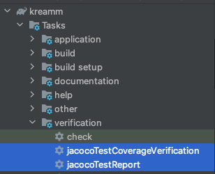 이제 오른쪽 Gradle탭에서 Tasks - verification쪽을 보면 위에서 설정한 2개의 태스크가 있음을 확인할 수 있다. jacocoTestConverageVerification은 내가 원하는(위에서 설정한 minimum) 커버리지 기준을 충족하는지 검사한다. 그리고 jacocoTestReport는 커버리지에 대한 리포트를 만들어준다.