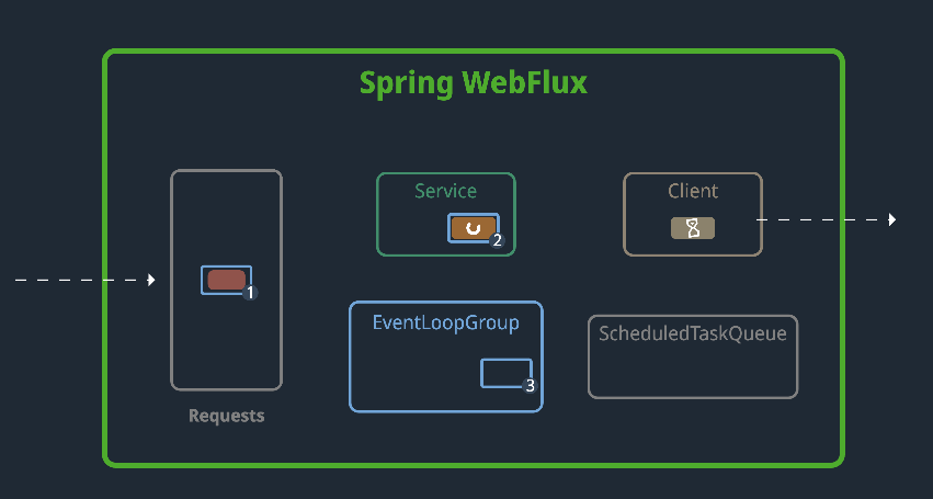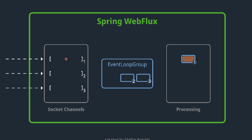 일반적으로 EventLoopGroup에 의해 관리되는 2개의 이벤트 루프가 항상 실행된다. 각 이벤트 루프는 요청을 수락하거나(서버 관점에서) 생성(클라이언트 관점에서) 할 수 있는 여러개의 SocketChannel을 처리한다. 새로운 소켓 채널이 생성될 때마다 하나의 이벤트 루프로 바인딩되고 이는 더이상 변경할 수 없다. 소켓은 하나의 이벤트 루프에 바인딩되며 더이상 변경할 수 없다는 점, 이것이 일반적인 스프링 MVC와의 가장 큰 첫 번째 차이점이다. 이는 블락킹된 이벤트 루프가 다른 이벤트 루프는 여유로운 상태임에도 불구하고 사용자로부터 오는 요청을 처리할 수 없는 상태가 된다는 것을 의미한다.