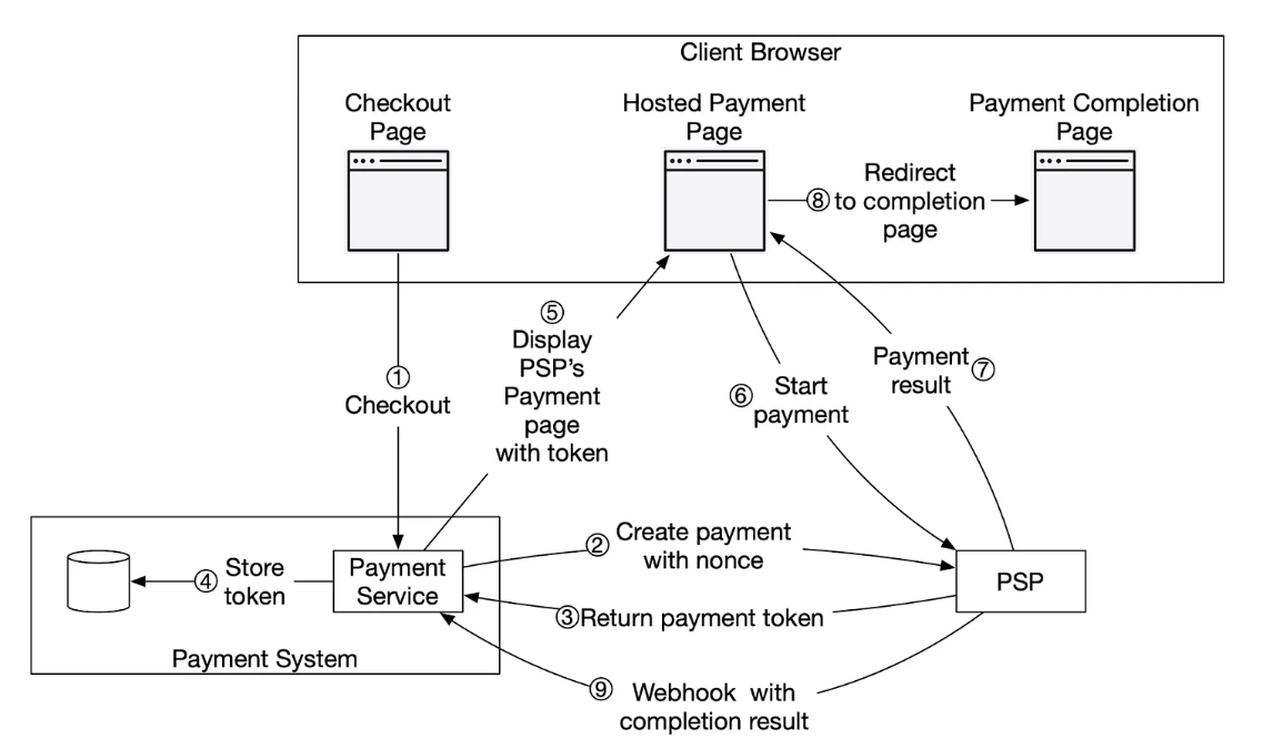 - 만약 회사가 법적인 이슈로 인해 결제 관련 민감 정보를 저장하지 않기로 했다면 PSP는 결제 세부정보를 수집하고 이를 PSP에 안전하게 저장할 수 있는 결제 페이지를 제공한다. 이는 대다수의 회사가 사용하는 방식이다.
