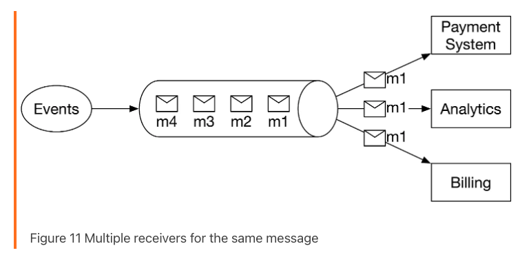 - 다중 수신기: 각 요청은 다중 수신기 또는 서비스에 의해 처리된다. 카프카가 보통 이렇게 동작한다. 컨슈머가 메시지를 수신하면 카프카에서 메시지를 삭제하지 않는다. 동일한 메시지는 다른 서비스들에서 처리될 수 있다. 이는 결제 서비스와 궁합이 잘 맞는데, 동일한 요청이 푸시 알림을 보내거나 결제 리포트를 업데이트하는 등 여러가지 일을 해야될수도 있기 때문이다. Figure 11이 이러한 예제를 보여준다. 결제 이벤트들은 카프카로 발행되며 결제 시스템, 분석 서비스, 정산 서비스등과 같은 각기 다른 서비스들이 메시지를 가져간다.