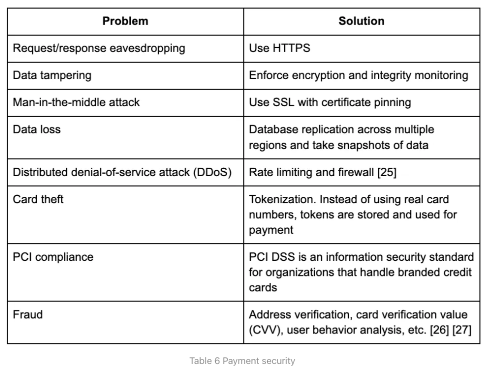 결제 보안은 굉장히 중요하다. 시스템 설계의 마지막 부분에서 사이버 공격 및 카드 도난에 대처하기 위한 몇가지 기술을 간략하게 다뤄본다.