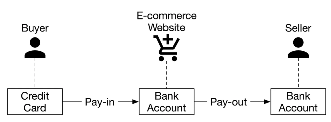 아마존과 같은 이커머스의 예제를 살펴보자. 구매자가 주문을 하면 돈은 아마존의 계좌로 들어가고 이게 pay in이다. 돈은 아마존 계좌에 있지만 아마존 소유는 아니다. 대부분은 판매자의 소유이며 아마존은 수수료를 받고 돈을 관리하는 역할만 수행한다. 이후 제품이 배송되면 수수료를 제외한 잔액이 아마존 계좌에서 판매자의 계좌로 이체된다. 이게 pay out이다. Figure 1은 이를 간단하게 도식화로 나타낸다.