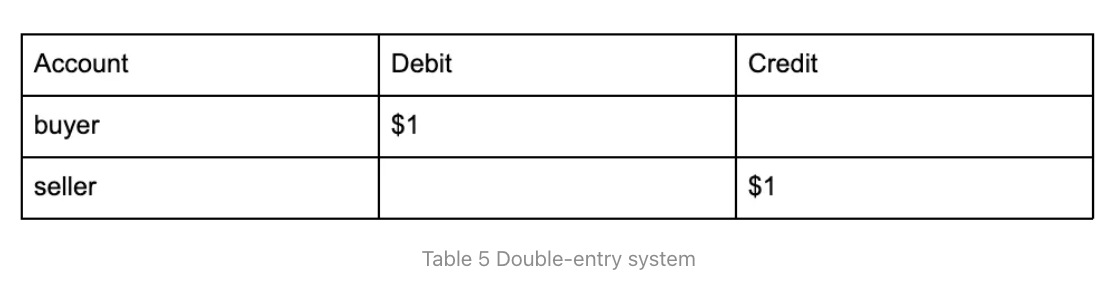 Double-entry 시스템의 모든 거래 항목의 합은 0이 되어야함을 나타낸다. 1센트를 잃었다는 것은 다른 사람이 1센트를 얻었다는 것을 의미한다. 이 시스템은 종단간 추적성을 제공하고 결제 주기 전반에 걸쳐 일관성을 보장한다.