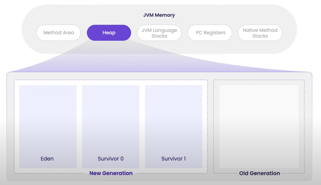 힙 영역은 New generation과 Old generation으로 나뉘어져있고 New generation은 다시 Eden영역, Survivor 영역으로 나뉘어져있다. 힙 영역에서 새롭게 저장되는 객체들은 Eden영역에 위치한다. 그러다 Eden영역이 꽉차게되면 해당 영역에 대해 GC가 발생하게 된다. 이 때 GC root로부터 참조가 끊긴 객체들은 수거되고 여전히 참조관계를 가지고 있는 객체들은 Eden에서 Survivor 영역으로 이동한다. 이렇게 이동 시 각 객체는 age bit라는 값을 가지게 되는데 이는 GC가 동작하고 살아남을 때 마다 1씩 증가하게 된다.