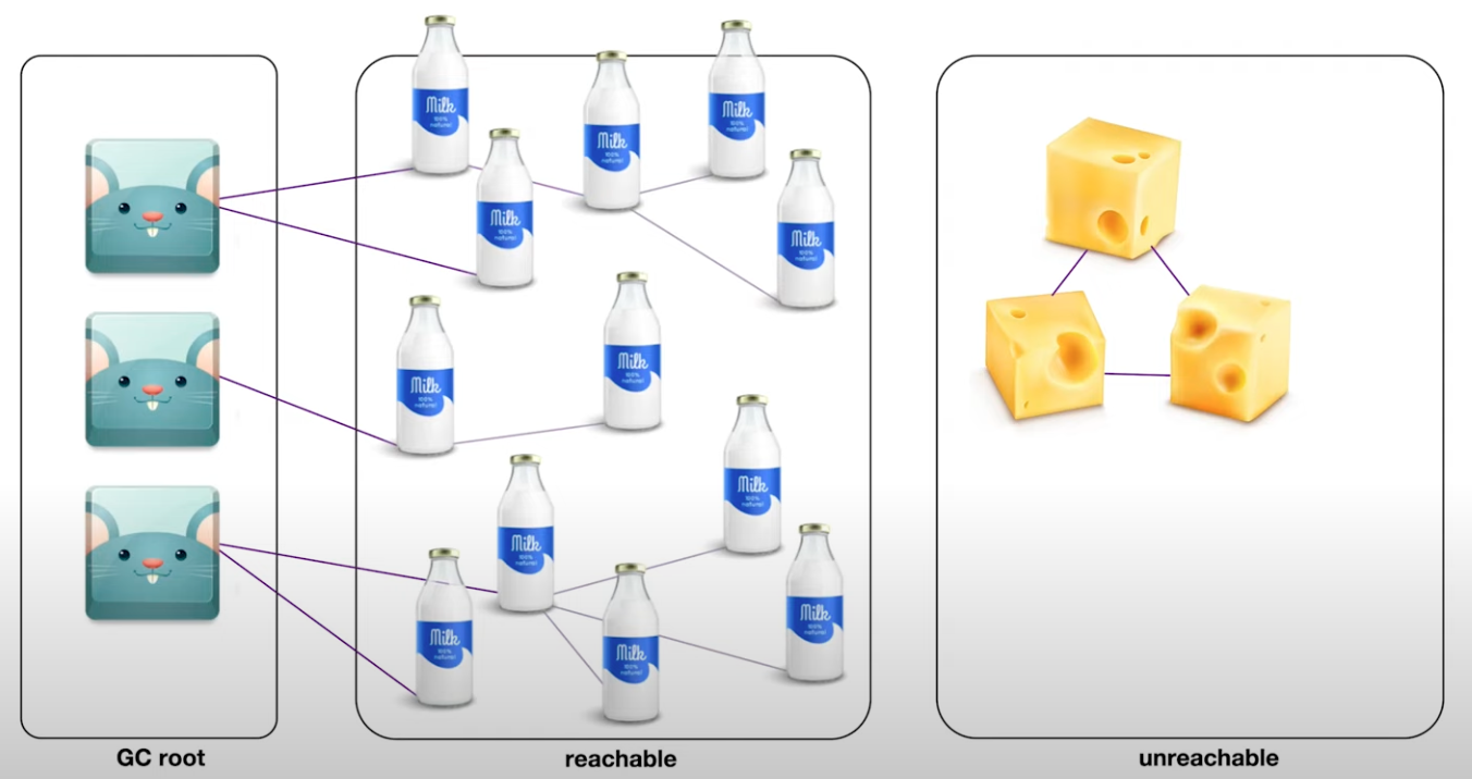 GC root가 도달할 수 있는 객체라면 GC가 동작해도 객체를 청소하지 않는다. 이러한 reachable한 객체와는 반대로 GC root로부터의 참조가 끊어진 객체들이 unreachable한 메모리이고 GC가 동작하면 이러한 메모리를 수거해간다. 이것이 GC의 대표적인 알고리즘인 Mark ans Sweep이다.