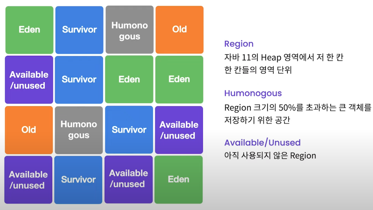 그림을 보면 네모 박스마다 모두 다른 영역이 섞여있다. 자바 11 힙 영역에서 각 칸들의 영역을 region이라고 불리는데 위에서 설명한 Eden, Survivor 말고도 2가지의 영역이 존재한다.
