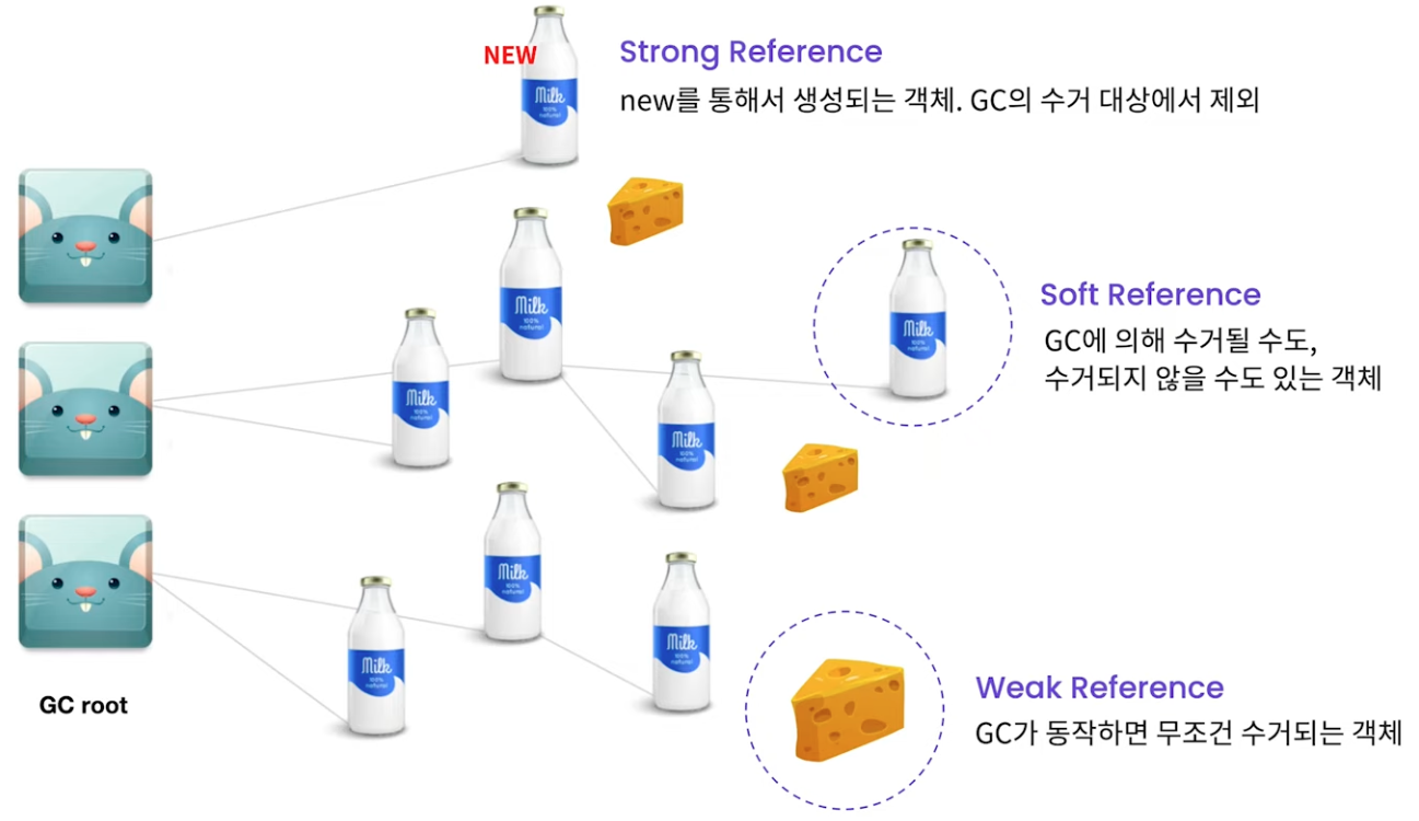 Strong Reference의 경우 GC의 대상에서 제외되는 강한 참조를 의미한다. 일반적으로 new를 통해 객체를 생성하는것이 Strong Reference이다. Soft Reference는 GC가 동작하면서 수거될수도, 수거되지 않을수도 있는 객체이다. 메모리에 충분한 공간이 있다면 GC가 수행되고 있더라도 수거되지 않는다. Weak Reference는 무조건 수거되는 참조 유형이다. 설령 GC root로부터 참조되는 reachable한 객체더라도 무조건 GC에 의해 수거되게 된다.
