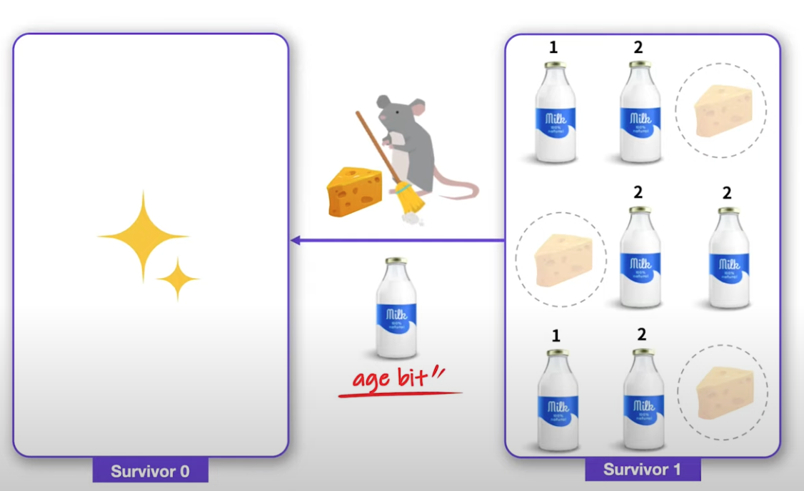 중요한 점은 Survivor영역의 경우 Survivor 0 영역과 1 영역 둘 중 하나는 반드시 비워져있어야 한다는 점이다. 그 이유는 0 영역이 꽉 찼다고 가정했을 때 해당 영역에 대해 GC가 발생하게 되고 살아남은 객체는 1 영역으로 이동해야하기 때문이다. 그래서 GC가 동작하고 Survivor 1 영역으로 객체들이 이동하면 Survivor 0 영역은 비워지게 된다. 이렇게 영역이 이동할때 위에서 말했듯이 age bit가 증가하게 된다.