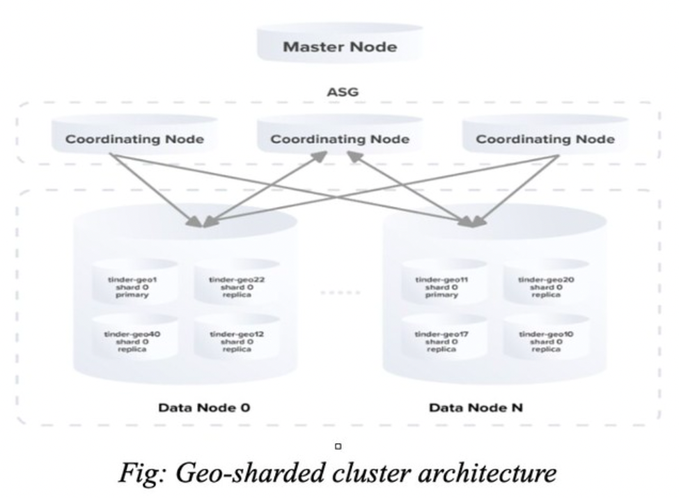 클러스터는 여러개의 마스터 노드로 구성되며 각 마스터 노드에는 두개의 Auto Scaling Group이 존재한다. 하나는 모든 요청이 보내지는 Coordinating Node에 대한 것이고 다른 하나는 모든 노드에 대한 것이다. 각 노드에는 무작위로 분산된 샤드의 인덱스가 포함된다. Coordinating Node는 각 유저에 맞는 노드에 쿼리하도록 조정하는 역할을 수행한다. 신뢰성과 견고함을 높이기 위해 지리적 위치를 사용하여 유저 데이터를 샤딩하고 각 샤드의 복제본 또한 생성한다.
