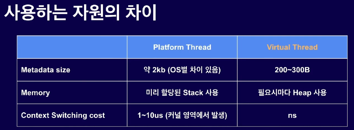 - Virtual Thread는 Platform Thread를 대체하려는 것이 아님, 둘다 사용 가능