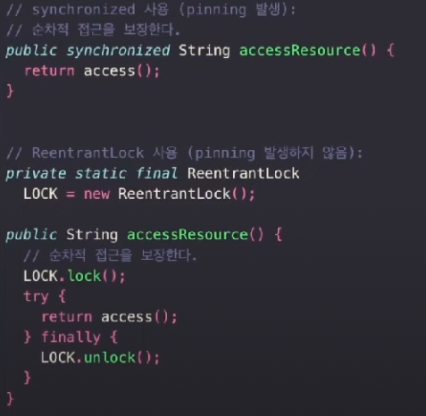 - synchronized 사용 시 Carrier Thread가 블락킹될 수 있기 때문에 주의가 필요하다. (ReentrantLock을 대신 사용)