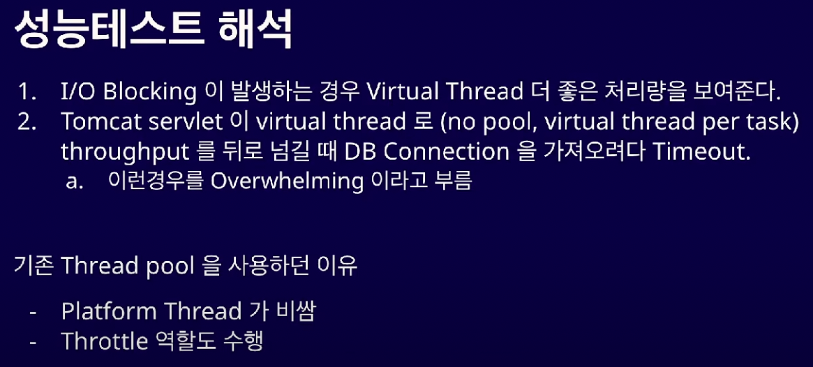 기존 Platform Thread의 경우 톰캣이 앞단에서 요청을 처리하고 뒤로 넘겨줄 때 가용가능한 스레드가 존재하지 않는 경우(충분히 트래픽을 받지 못하면) 기다려야하는 상황이 발생했지만 Virtual Thread의 경우 톰캣이 앞단의 요청을 모두 소화하고 뒤로 넘겨줬지만 뒷단에서 DB 커넥션을 기다리다가 타임아웃 익셉션이 발생한 것이다. 이말인즉슨 Virtual Thread를 그냥 적용하면 처리량이 좋아지는 상황만을 기대했겠지만 실제로는 좀 더 많은 고민이 필요하다는 것을 의미한다.