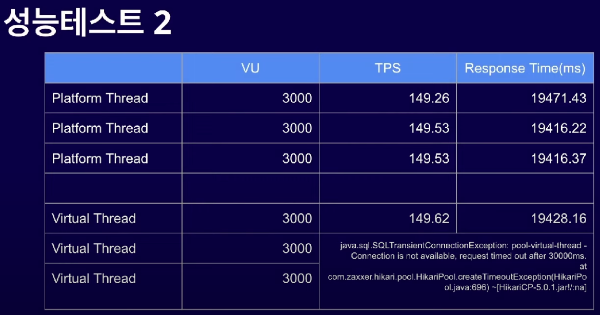 반면 Virtual Thread는 첫 번째 TPS는 Platform Thread와 동일한 수치를 보여줬지만 나머지 2, 3번째 테스트 시 DB 커넥션 에러가 발생한다.