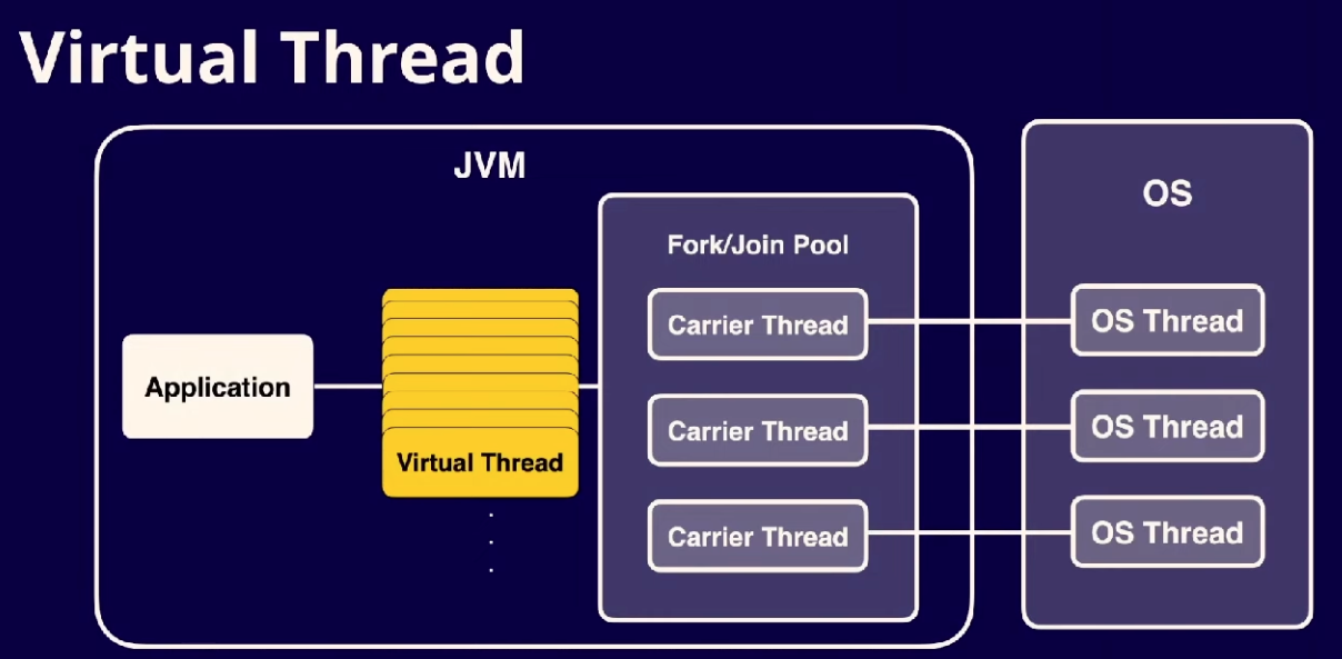 Virtual Thread의 경우 앞단에 Virtual Thread들이 따로 존재한다. 그리고 뒷단에 Fork/Join Pool이 있고 내부에 Carrier Thread가 들어있는데 이 스레드가 위에서 설명한 Platform Thread와 유사한 형태라고 생각하면 된다. 하지만 우리가 명시적으로 Carrier Thread를 사용하는것이 아니고 내부적으로 Virtual Thread가 어떤 Carrier Thread를 사용할 지 결정한다. 어플리케이션에서는 Carrier Thread가 아니라 Virtual Thread만 사용한다. (Carrier Thread는 마찬가지로 OS Thread와 1:1 매핑된다.)