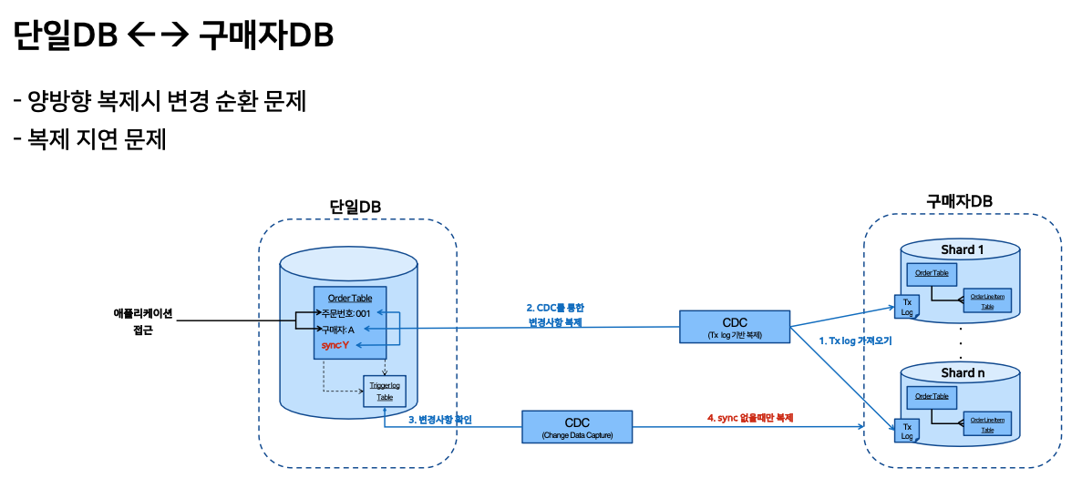 단일 DB에서 구매자 DB로 넘어갈 때 핵심은 CDC이다. 네이버페이의 경우 단일 DB에 있어 CDC를 적용할 수 없는 상황이었다. 따라서 DB레이어에서 트리거를 이용하여 변화를 감지하도록 만들었다. 이는 MySQL의 binlog, MongoDB의 oplog와 같은 방식보다는 부하가 심하겠지만 어쩔 수 없는 상황이었다. 대상이 되는 테이블에 UPDATE/DELETE/INSERT 등의 쓰기 오퍼레이션이 발생하면 해당 내용을 별도 테이블에 쓰도록 트리거를 생성했다. 따라서 타겟이 되는 데이터가 바뀌었을 때 해당 데이터의 PK를 저장하도록 했고 CDC에서는 이 PK를 주기적으로 읽어서 해당하는 테이블에 PK를 통해 조회하고 반대편 샤드 DB에 복제하는 방식이다.