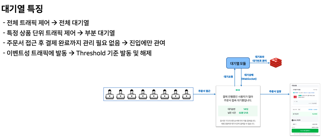 많은 트래픽이 몰리면 대기열을 사용한다. 주문서에 한번 진입하면 그 뒤는 특정하게 트래픽을 발생시키는 요인이 없기 때문에 주문서 입구까지만 대기열을 적용했다. 여기에도 몇가지 문제가 있었는데, 주문서 대기열을 거쳐 들어왔다 하더라도 해당 페이지를 떠나지 않고 계속 품절된 상품에 주문을 시도하는 유저들이 있다. 이런 경우 품절 상품이라면 페이지를 이동시키도록 했다.